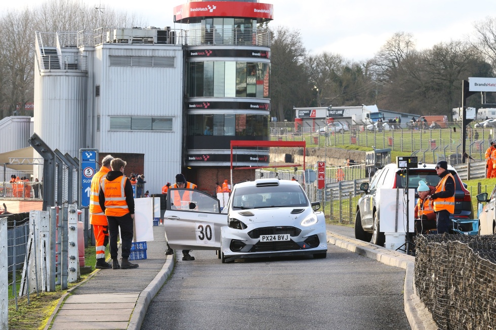 Early morning rain made the tarmac very slippery at the former home of the British GP, where action started at 9.00am with the first of eight roughly four-mile stages. There was lengthy stoppage after around 25 cars in SS1 to clear a Fiesta R5 from the Paddock Hill Bend gravel trap, where it had struck a Ford Escort already beached.